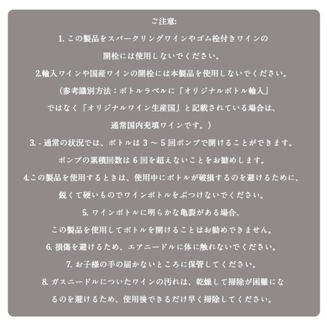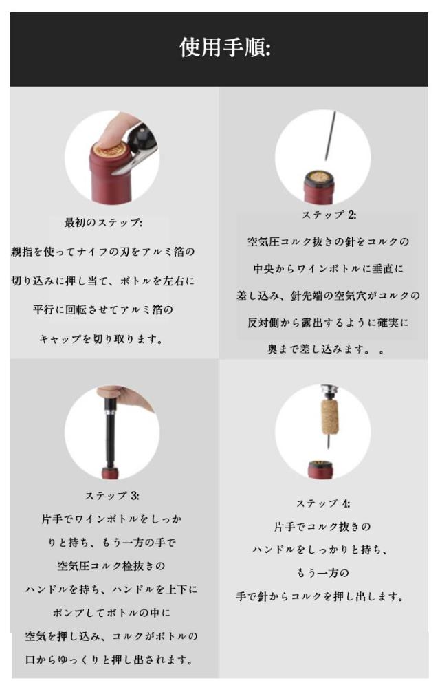| 空気圧式栓抜きは、空気圧の原理を利用して、小さな針を通してボトル内に空気を送り込み、ボトル内の気圧を上昇させ、内外の圧力差を利用してコルクを完全に押し出します。コルクに痕跡は残りませんが、そのプロセスは目を引きます。 シェルのハンドルは人間工学に基づいたライトカーブデザインを採用し、スリーブのサイズを大きくして手のひらにフィットするようになり、握りやすくポンピングが容易になりました。 インフレーターニードルチューブは高強度、高靭性鋼と食品接触コーティングで作られており、抵抗が少なく、コルクの抜き差しが容易です。プラグを外すときはスライドを使って押し出すだけです。 エアレーションニードルはコルクを貫通し、小さなピンホールしか生じないため、コルクを損傷せず、おがくずがボトルに落ちることもないため、ワインの汚染を避け、本来の風味や味に影響を与えません。 使用手順: 最初のステップ: 親指を使ってナイフの刃をアルミ箔の切り込みに押し当て、ボトルを左右に平行に回転させてアルミ箔のキャップを切り取ります。 ステップ 2: 空気圧コルク抜きの針をコルクの中央からワインボトルに垂直に差し込み、針先端の空気穴がコルクの反対側から露出するように確実に奥まで差し込みます。 。 ステップ 3: 片手でワインボトルをしっかりと持ち、もう一方の手で空気圧コルク栓抜きのハンドルを持ち、ハンドルを上下にポンプしてボトルの中に空気を押し込み、コルクがボトルの口からゆっくりと押し出されます。 ステップ 4: 片手でコルク抜きのハンドルをしっかりと持ち、もう一方の手で針からコルクを押し出します。 ご注意: 1. この製品をスパークリングワインやゴム栓付きワインの開栓には使用しないでください。 2.輸入ワインや国産ワインの開栓には本製品を使用しないでください。 (参考識別方法:ボトルラベルに「オリジナルボトル輸入」ではなく「オリジナルワイン生産国」と記載されている場合は、通常国内充填ワインです。) 3. - 通常の状況では、ボトルは 3 〜 5 回ポンプで開けることができます。ポンプの累積回数は 6 回を超えないことをお勧めします。 4.この製品を使用するときは、使用中にボトルが破損するのを避けるために、鋭くて硬いものでワインボトルをぶつけないでください。 5. ワインボトルに明らかな亀裂がある場合、こ | |