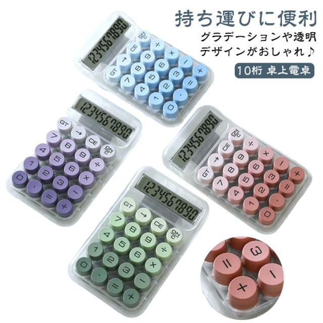 | 持ち運びに便利 グラデーションや透明デザインがおしゃれ♪ 10桁 卓上電卓 毎日がもっとワクワクする、ポップでキュートな電卓。 親しみやすいラウンドフォルムと丸みを持たせたサイドの形状で、手にした際に持ちやすい。 かわいく丸いキーボタンを採用し、カジュアルなデザインとの統一感を演出。 そのままデスクに置いておいてもインテリアになるおしゃれなデザインです。 | |