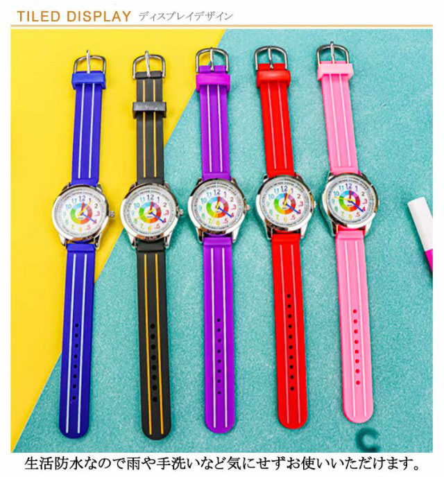 | 1時間ごとの「色分け」の直感的なデザイン、子供が楽しく学べるおしゃれなキッズウォッチ。 生活防水なので雨や手洗いなど気にせずお使いいただけます。 時間の流れが実感できるおしゃれなアナログキッズ腕時計です。 | |