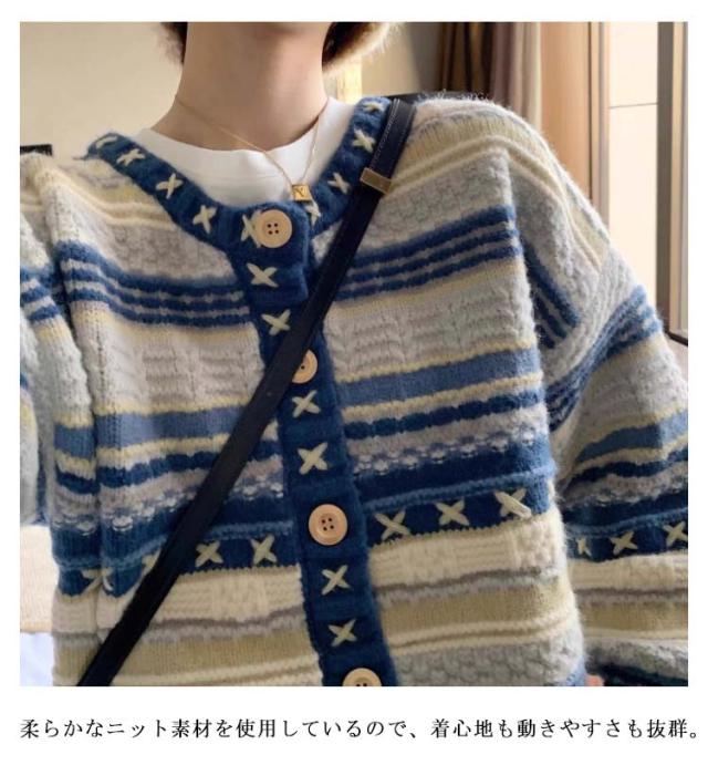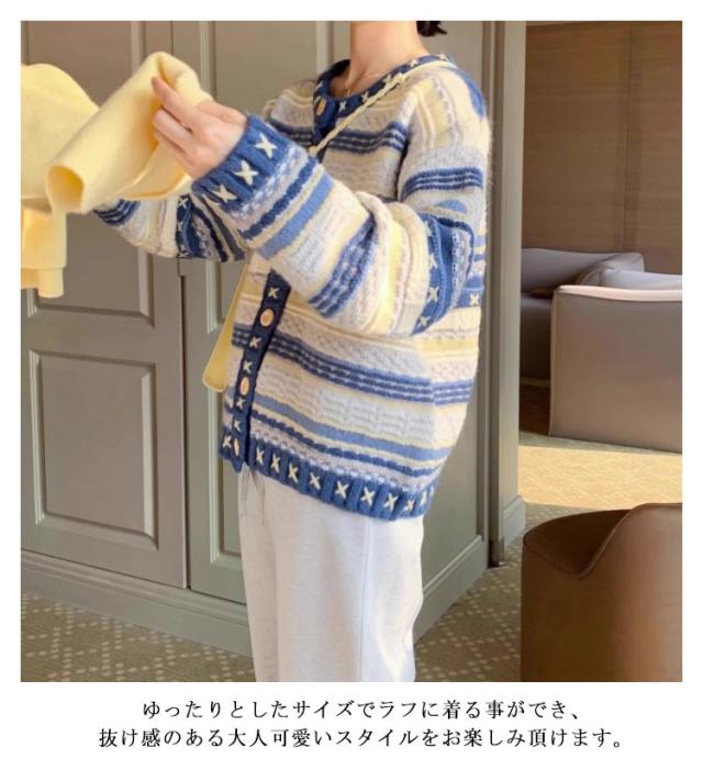プルオーバー ノルディック柄 アーガイル柄 ニットカーディガン 秋冬 レディース ボタン カジュアル ノルディック柄 カーディガン 羽織り フロントボタン ラウンドネック ニット ボーダー 柄編み 大人可愛い レトロ オシャレ