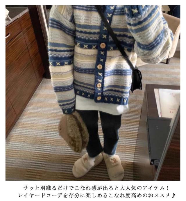 | 北欧風のノルディック柄とボーダー柄を合わせた存在感のあるクルーネックのカーディガン。 柔らかなニット素材を使用しているので、着心地も動きやすさも抜群。 ふわっとモヘア感とドロップショルダーで抜け感も演出してくれます。 レトロ感のあるニットは見た目よりも合わせやすく暗くなりがちな秋冬コーデのアクセントに。 ゆったりとしたサイズでラフに着る事ができ、抜け感のある大人可愛いスタイルをお楽しみ頂けます。 サッと羽織るだけでこなれ感が出ると大人気のアイテム!レイヤードコーデを存分に楽しめるこなれ度高めのおススメ♪ | |