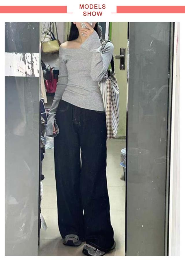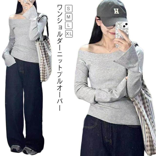 プルオーバー ニット カットソー スリム 長袖 トップス カットソー ニットセーター ぴったり 細身 ワンショルダー ワンショルダー フィット オフショル 着痩せ きれいめ 大人可愛い 春