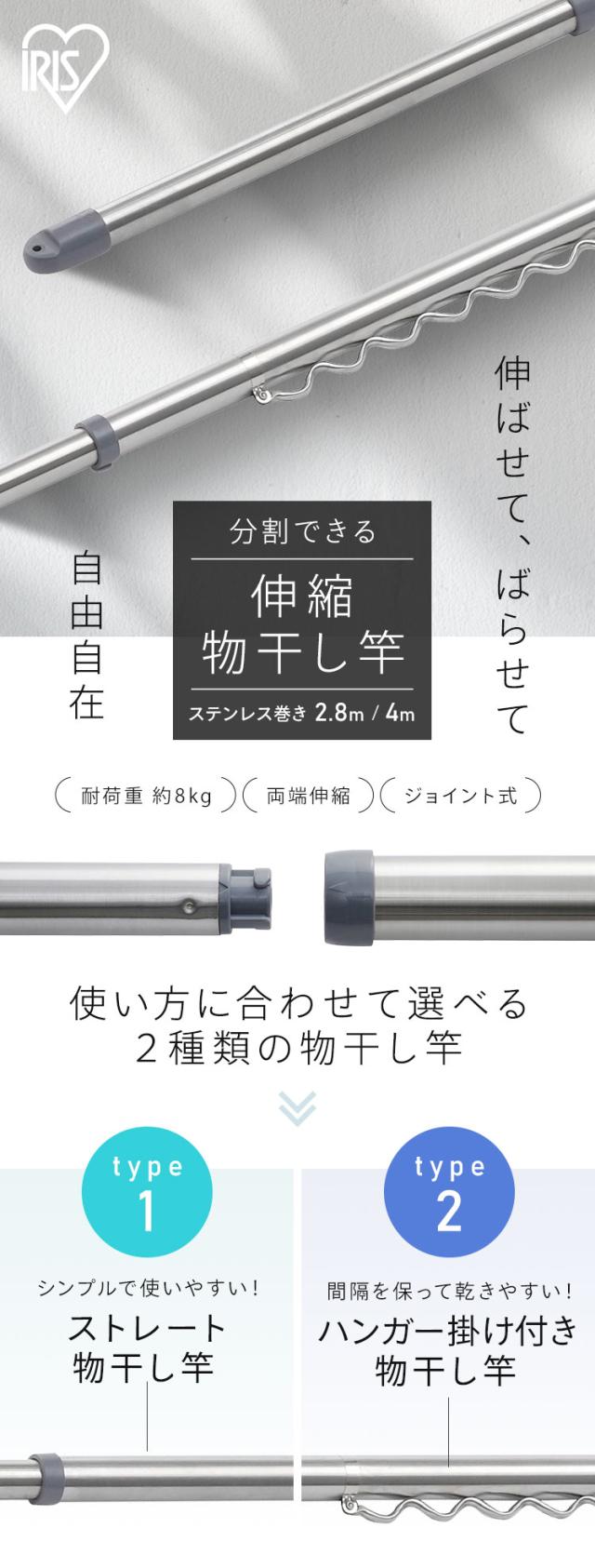 \選べるセット/ 物干し竿 4m ステンレス 伸縮物干し竿 2.8〜4m ストレート ハンガー掛け付 軽量 組立簡単 屋外 ベランダ物干し アイリスオーヤマ SU-400C SU-400CH *