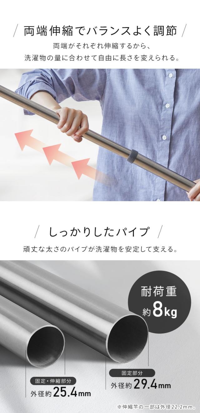 両端がそれぞれ伸縮するから、洗濯物の量に合わせて自由に長さを変えられる。