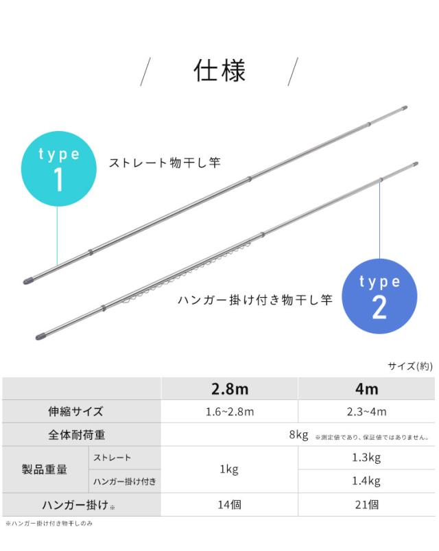 (検索用:選べるセット・物干し竿・4m・ステンレス・伸縮物干し竿・2.8〜4m・ストレート・ハンガー掛け付・軽量・組立簡単・屋外・ベランダ物干し・4967576741002・4967576741019・アイリスオーヤマ)
