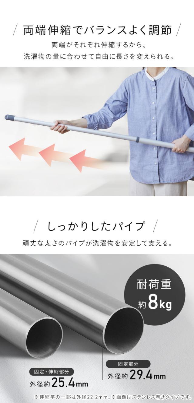 両端がそれぞれ伸縮するから、洗濯物の量に合わせて自由に長さを変えられる。