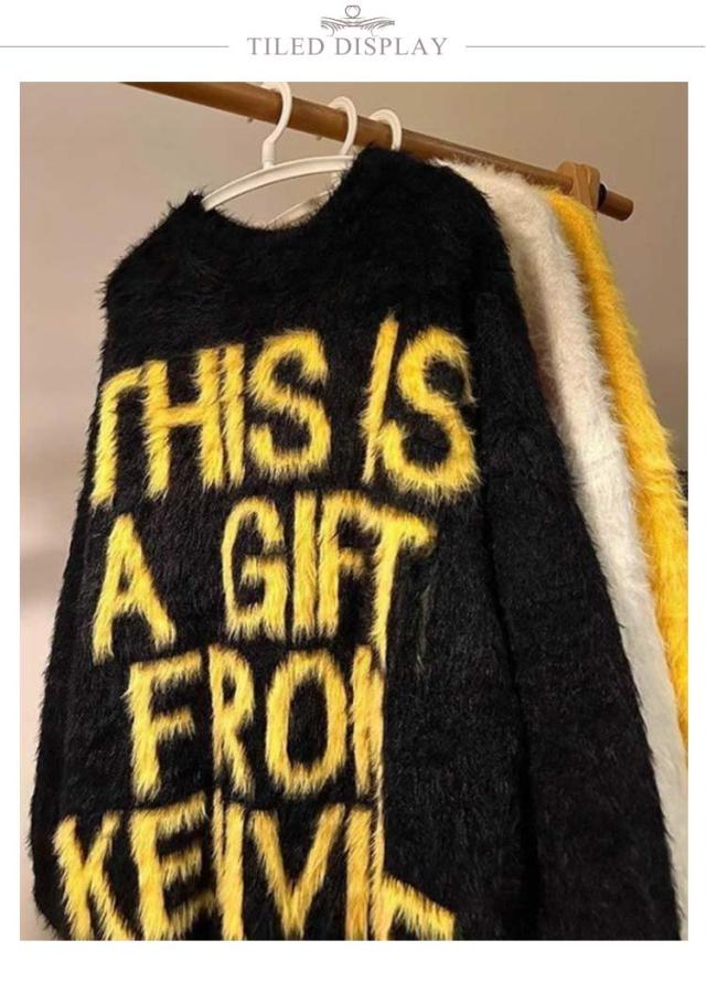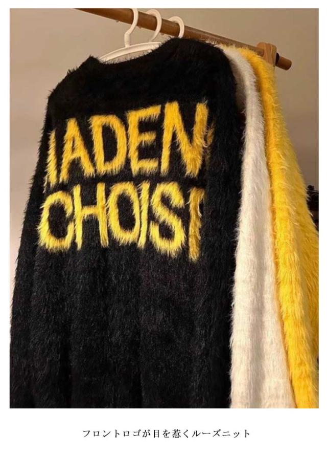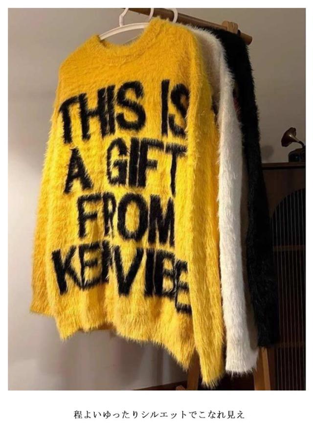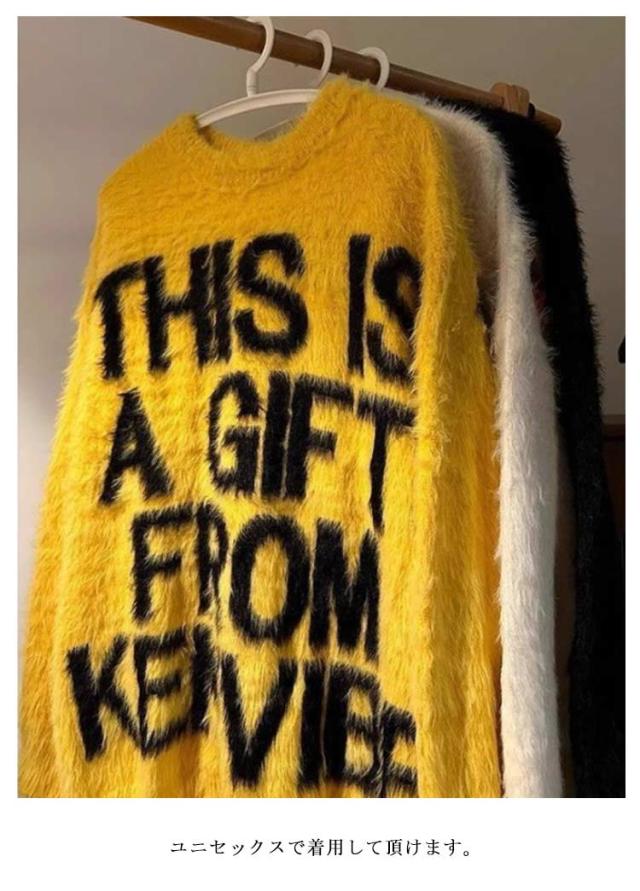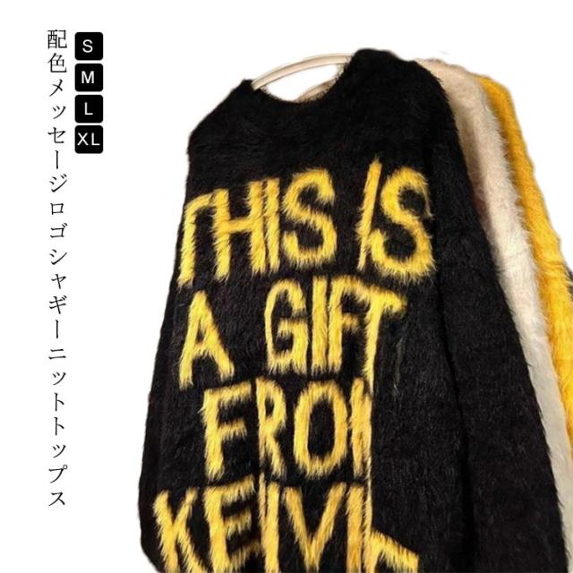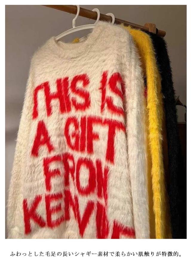シャギーニット トップス セーター ミディアム丈 ニット シャギーニット ロゴニット メッセージニット メンズ レディース プルオーバー 長袖 ふわふわ 柔らかい 毛足が長い 秋