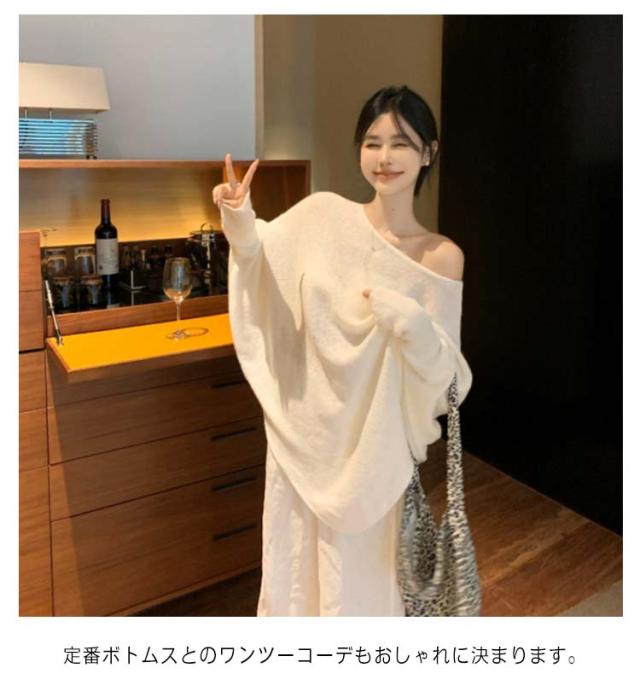セーター ミディアム丈 レディース アシンメトリー トップス ワンショルダー きれいめ 肩開き ワンショルダー プルオーバー 体型カバー 大人 ボリュームスリーブ シンプル 無地 フリーサイズ 秋