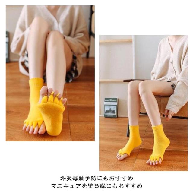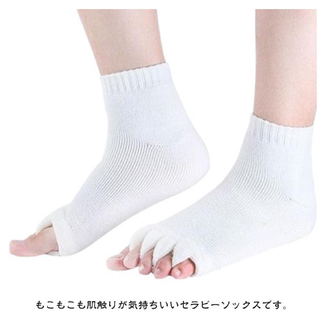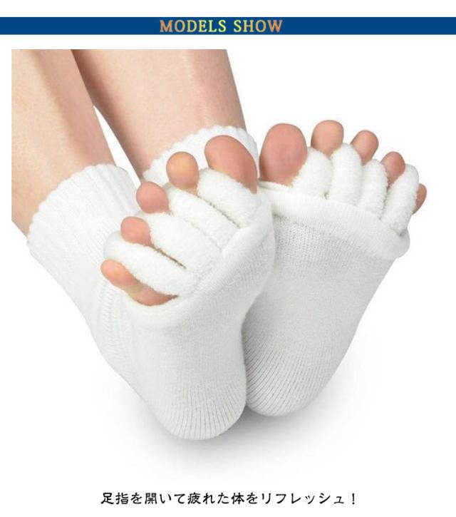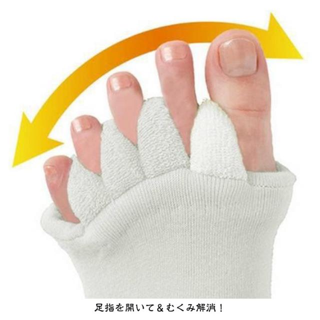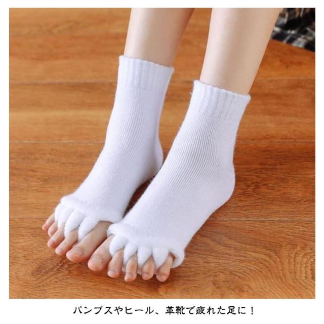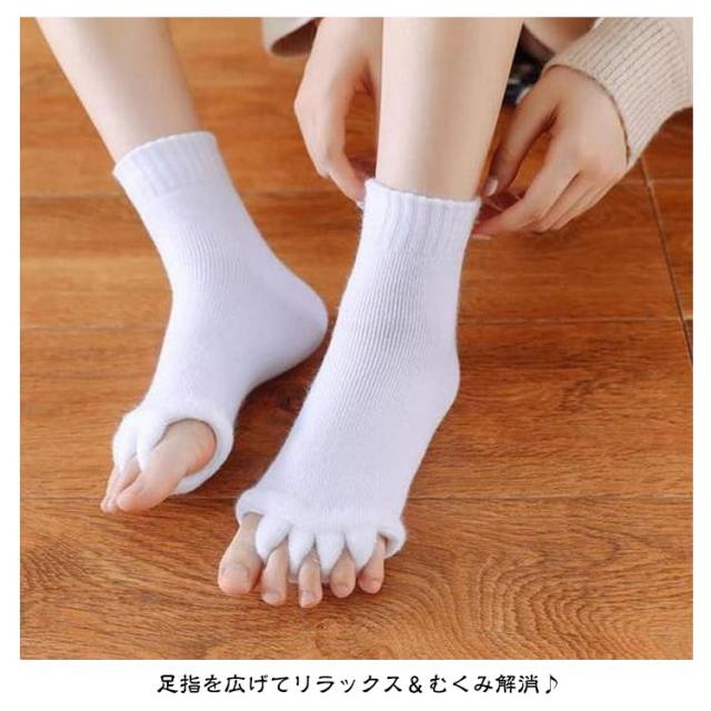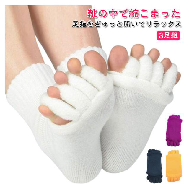 | 【靴の中で縮こまった足指をぎゅっと開いてリラックス】【3足組】 足指を開いて疲れた体をリフレッシュ! もこもこも肌触りが気持ちいいセラピーソックスです。 パンプスやヒール、革靴で疲れた足に! 足指を広げてリラックス&むくみ解消♪ 旅行先や出張先にもっていくのもオススメです! 足指を開いて&むくみ解消! 足指間の蒸れ防止で臭いの解消にも 外反母趾予防にもおすすめ マニキュアを塗る際にもおすすめ | |