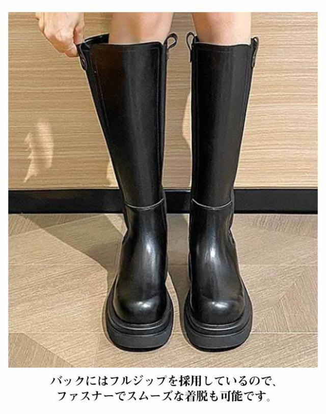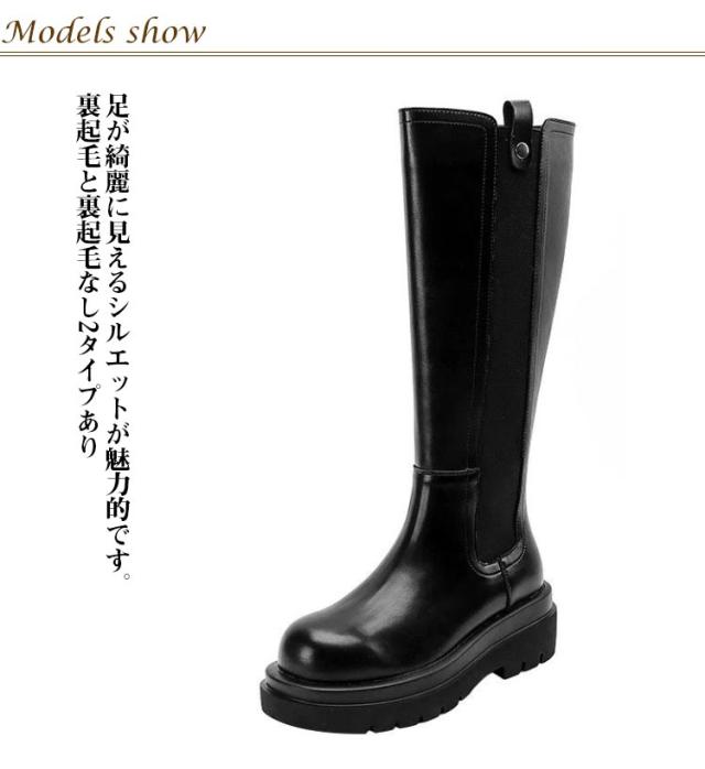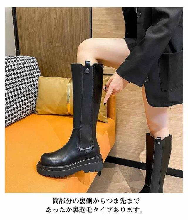 春 レディース 足長効果 サイドゴアブーツ 厚底 ロングブーツ トラックソール 筒太め ラウンドトゥ 細見え バックファスナー 疲れない 秋 冬 ゆったり ロングブーツ ブーツ 筒周り あたっか 防水 撥水 pu 革ブーツ 防寒 保温