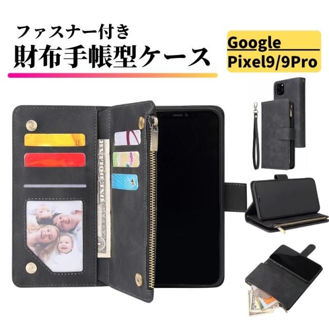 Google Pixel 9 / 9Pro ケース 手帳型 お財布 レザー カードケース ジップファスナー収納付 おしゃれ スマホケース 手帳 Pixel9 Pixel9Pro プロ ブラック