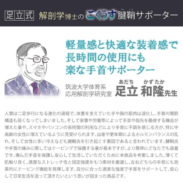 足立式 手首腱鞘サポーター 1枚 解剖学博士 足立和隆先生 男女兼用 フリーサイズ テーピングベルトで手首をサポート ![]() ![]() ![]() ![]() ![]() | ||||