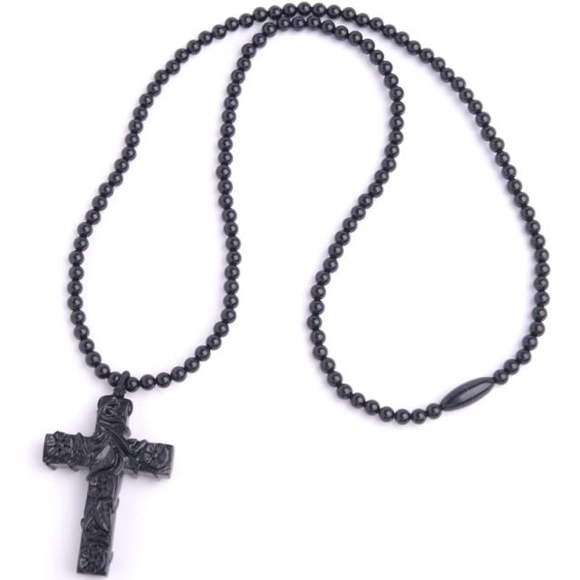 ジェット十字架ネックレス 天然ジェットロザリオ ロング 手彫り モーニングジュエリー