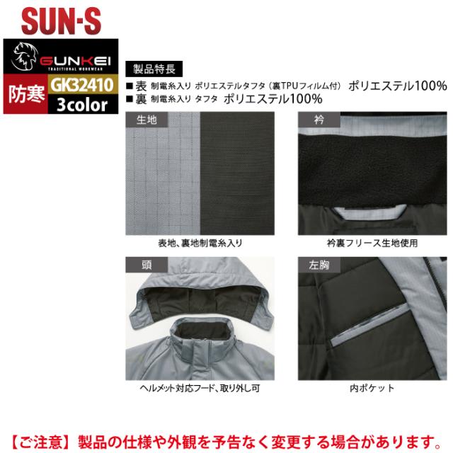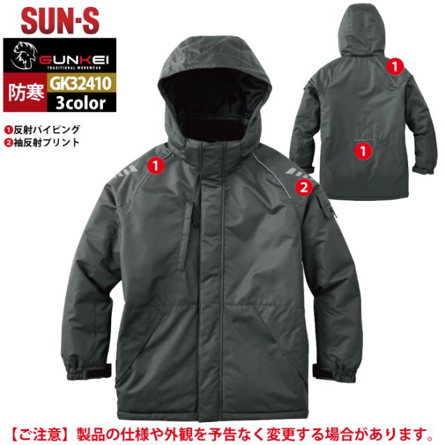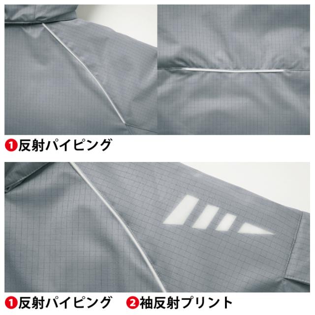 ◇機能:JIS-T8118適合商品・表地裏地制電糸入り・衿裏フリース生地使用・ヘルメット対応フード・フード取り外し可・内ポケット・脇ポケット被せ・マジックテープ(物が落ちにくい・雨水の浸入防止)・胸ポケットファスナー玉縁(ポケットに雨水の浸入防止)・左袖ポケット内のペン差し(フラップを閉めてもペンが収納)反射パイピング・袖反射プリント