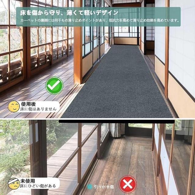 廊下マットは、床を保護し、床面が傷つくのを防ぎます。マットの底部は通常、滑り止め材料で作られており、マットが床面に安定して固定され、滑りを防止します。