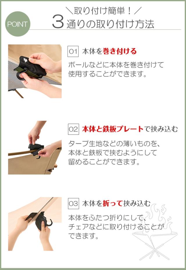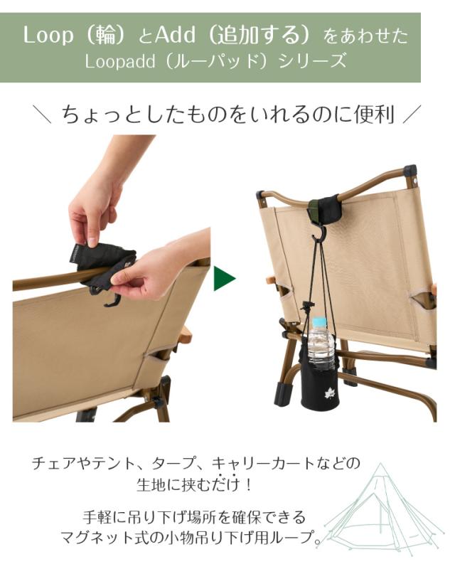チェアやテント、タープ、キャリーカートなどの生地に挟むだけで、手軽に吊り下げ場所を確保できるマグネット式の小物吊り下げ用ループ。