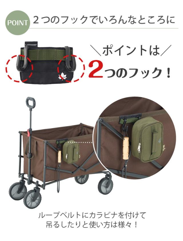 フックが2つ付属し、フックに掛けたり、ループベルトにカラビナを付けて吊るしたりと使い方は様々。