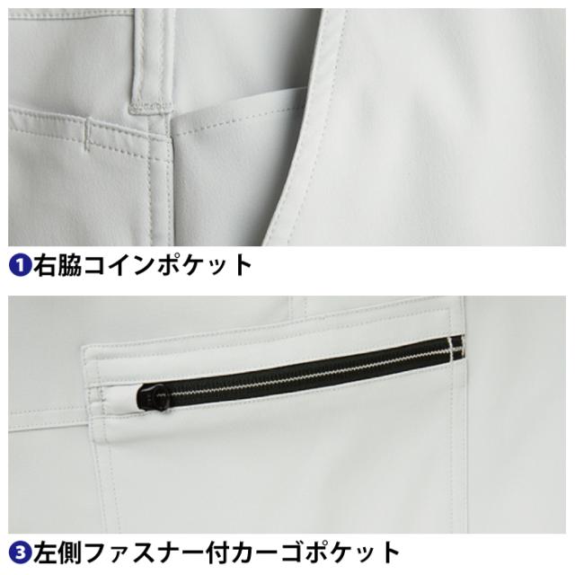 ◇機能:右胸マルチポケット(携帯や野帳が入る)・右胸ファスナーポケット・内ペン差し・左胸ネームループペン差し付ポケット・両袖ペン差し・トリカット・調整ボタン(裾・カフス)・反射テープ