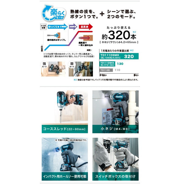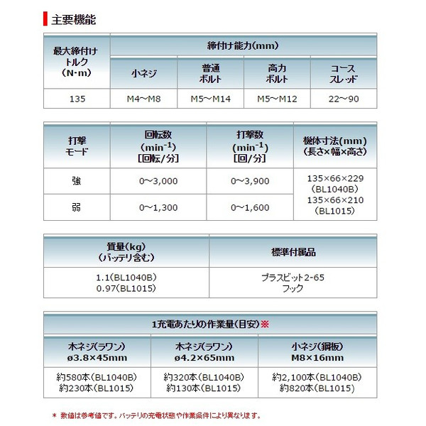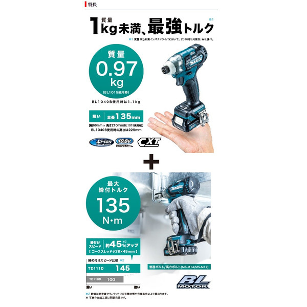 ※質量1kg未満インパクドライバにおいて。 2016年8月現在、マキタ社調べ。