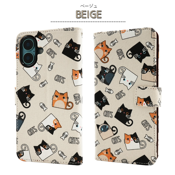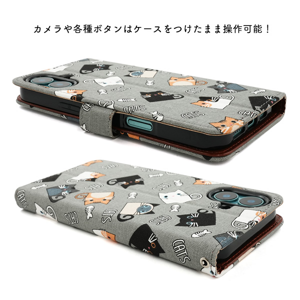 食いしん坊な猫ちゃん達を全面にプリントした生地を使用した手帳型ケースです。 衝撃やキズなどからスマートフォンを守るのはもちろん カメラや各種ボタンなど、ケースに入れたまま操作可能です。 内部はソフトケースなので着脱が簡単! 横開きタイプなので、手帳のように使うことができます。 内側にはカードポケットとサイドポケットが付いています。 また、ストラップとストラップホール付きです。 カラーはベージュとグレーの2色からお選びいただけます。 | ||||||||||||||