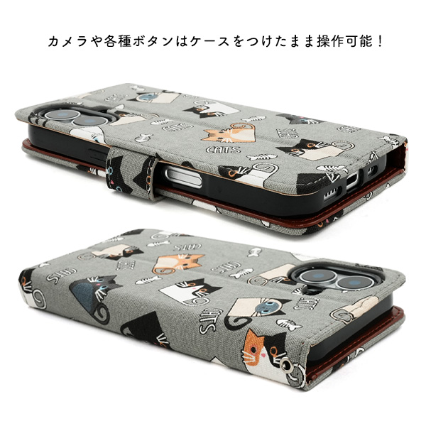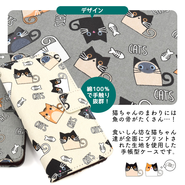 食いしん坊な猫ちゃん達を全面にプリントした生地を使用した手帳型ケースです。 衝撃やキズなどからスマートフォンを守るのはもちろん カメラや各種ボタンなど、ケースに入れたまま操作可能です。 内部はソフトケースなので着脱が簡単! 横開きタイプなので、手帳のように使うことができます。 内側にはカードポケットとサイドポケットが付いています。 また、ストラップとストラップホール付きです。 カラーはベージュとグレーの2色からお選びいただけます。 | ||||||||||||||