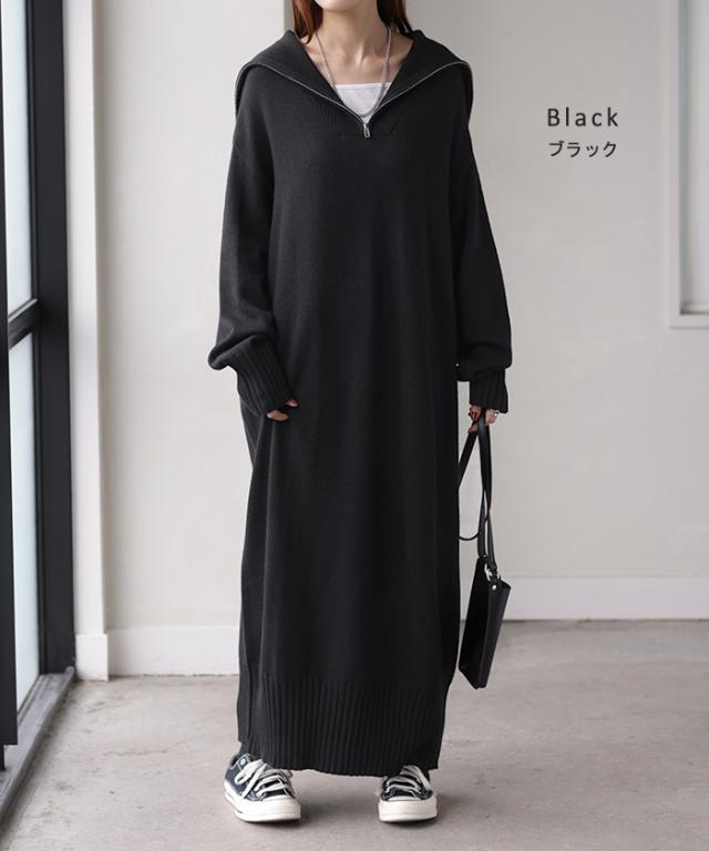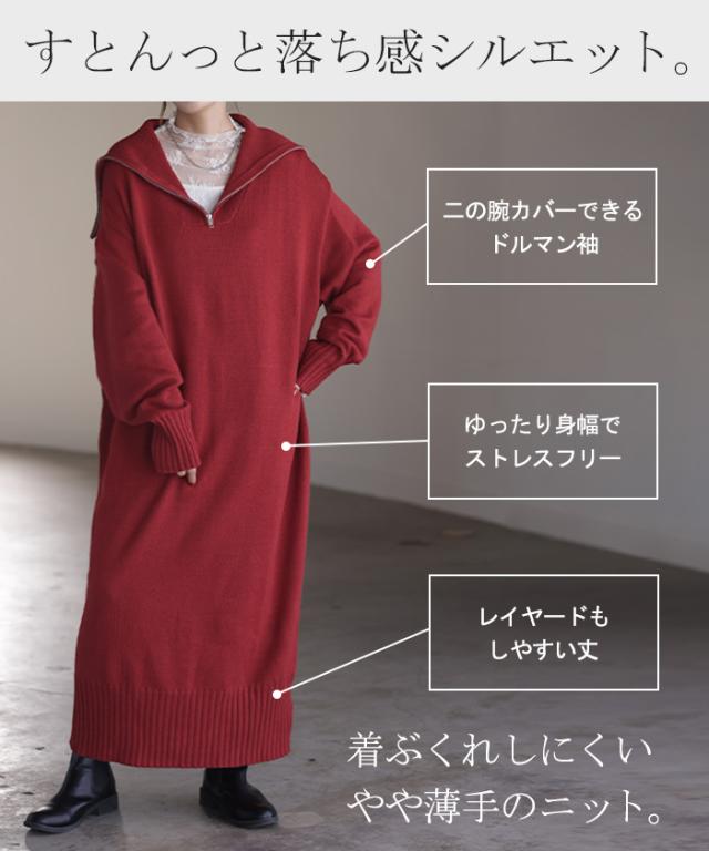 ワンピース ニット ハーフジップ ワンピ セーター レディース ニットワンピース ニットワンピ ロング ロングワンピース 長袖 ハイネック Vネック マキシ シンプル タイト Iライン 体型カバー きれいめ 上品 黒 赤 秋 冬 HUG.U 秋新作