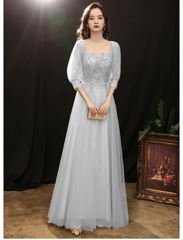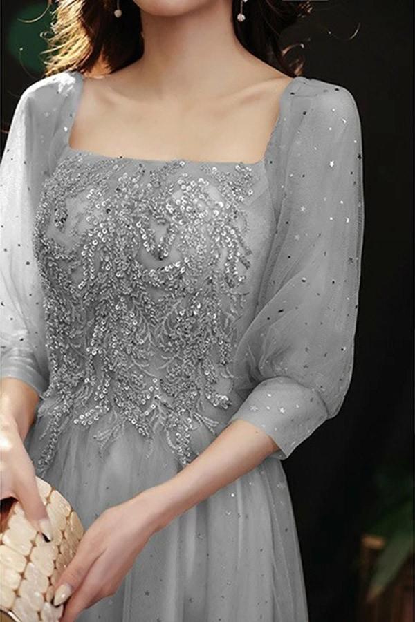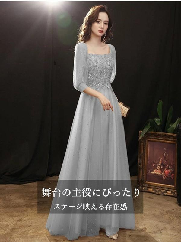 ロングドレス 袖付き 演奏会用ドレス グレー 結婚式ワンピース ピアノ発表会 ドレス 大人 パーティードレス ステージドレス 他と被らない 大きいサイズ 上品 グレー Aライン お呼ばれドレス XS S M L XL 2XL da015sasam5