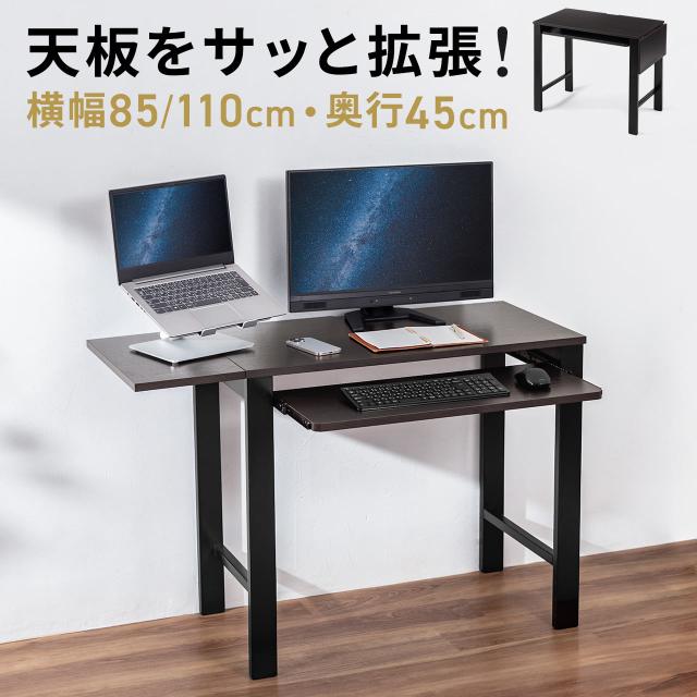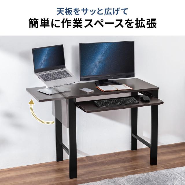 ⇒ご購入の前にご確認下さい広くない場所でも天板拡張で広々作業ができるワークデスク。横幅はコンパクトな85cmから110cmまで広くできる。キーボードスライダー付。【WEB限定商品】