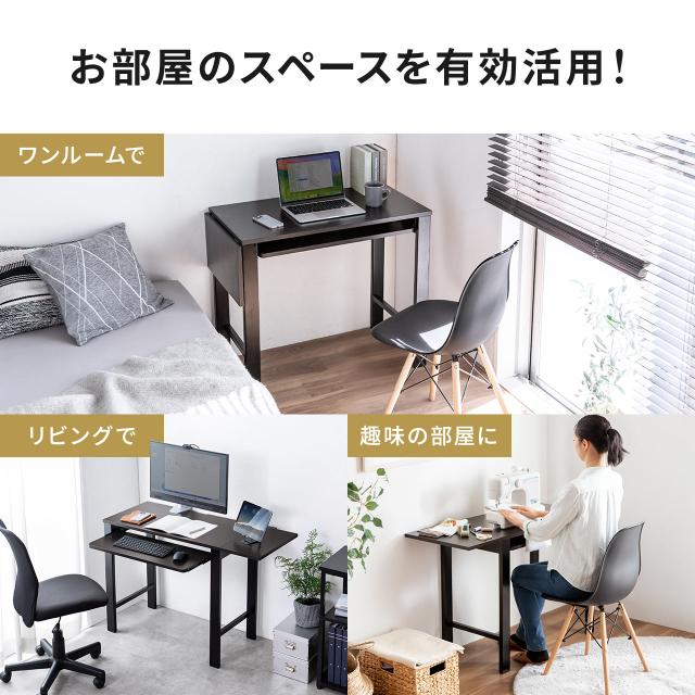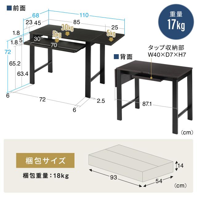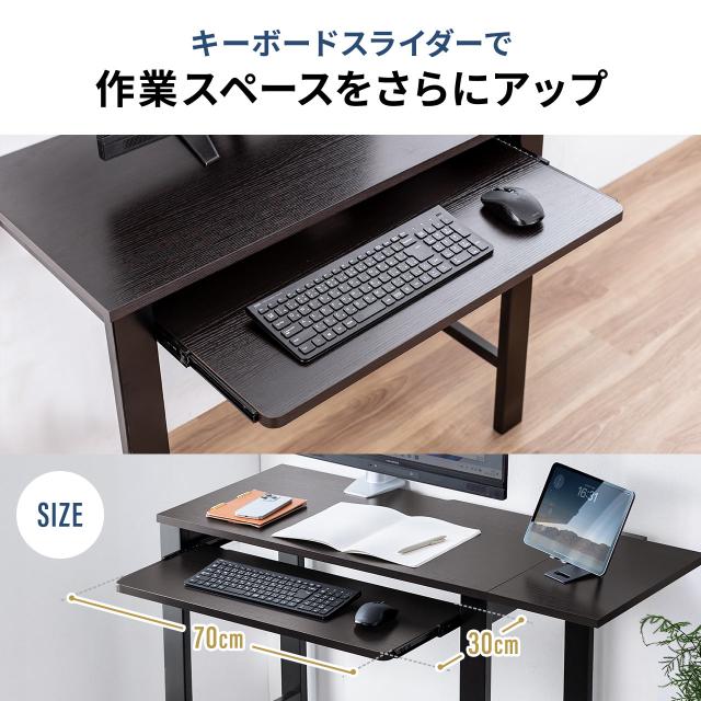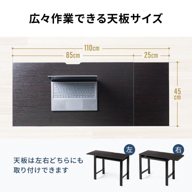 ●幅85×奥行き45cmのコンパクトなデスクは、使用時に幅110cmに拡張され、さらにW70×D20cmのキーボードスライダーが使用可能です。●天板の拡張は初期設定で左右どちらにも設定できます。