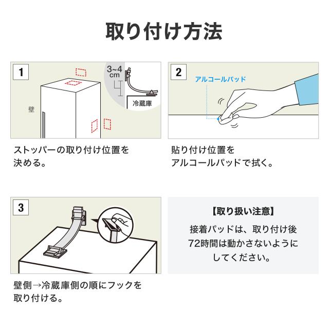 ⇒ご購入の前にご確認下さい冷蔵庫に最適な地震対策固定ベルト。壁に穴をあけることなく、2本のベルトを接着テープで固定可能。従来品よりベルトが長くなったので冷蔵庫上のコンデンサーが邪魔にならず設置可能。震度6強相当対応。【WEB限定商品】