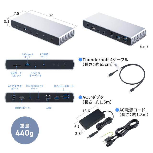 Thunderbolt4 ドッキングステーション 2画面出力 TB4×2ポート HDMI×1 96W PD充電 TB4ケーブル付き 40Gbps 4K/60Hz×2画面 USB A ×4[400-VGA027]