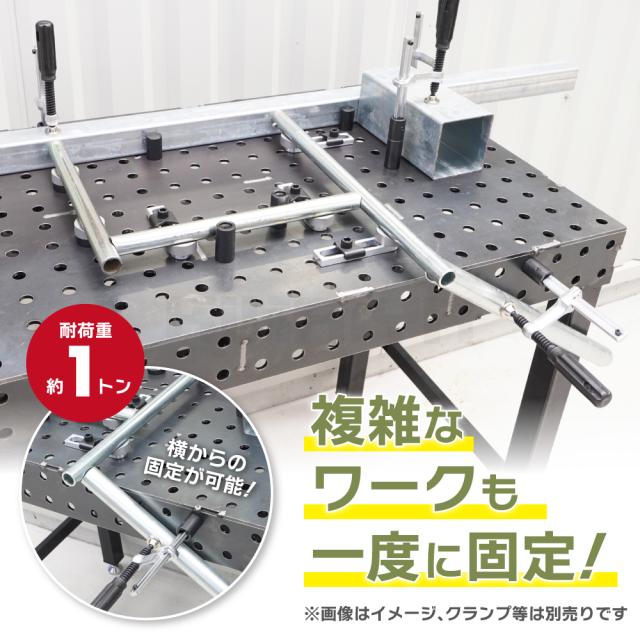 溶接作業を効率化! 立体的に固定できる頑丈な溶接テーブル ●スチール製の、立って作業がしやすい880mm高の作業台です ●天板とサイドには50mm間隔で穴が開いており、専用クランプが差し込めます ※クランプ等は別売りです ●3D設計により側面からもクランプを自由に配置できるので、 作業効率を飛躍的に向上させます ●取り外し可能なツールトレイ付き ●お客様組み立て商品です ※組み立てには溶接が必要です ※三角ホルダーなどで固定した後、ズレがないかよく確認してから溶接してください ※天板が落ちないよう、接続部は隙間なく埋めてください ※テーブル足の組み立てには六角レンチ5mmをご使用ください ※転倒や挟み込みに注意し、作業に適した服装でご使用ください |