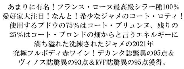 コート ロティ 2021 年 蔵出し作品 驚異の22ヶ月樽熟成 ドメーヌ ジャメ元詰 シラー種100% イギリスのデカンタ誌驚異の95点&正規品