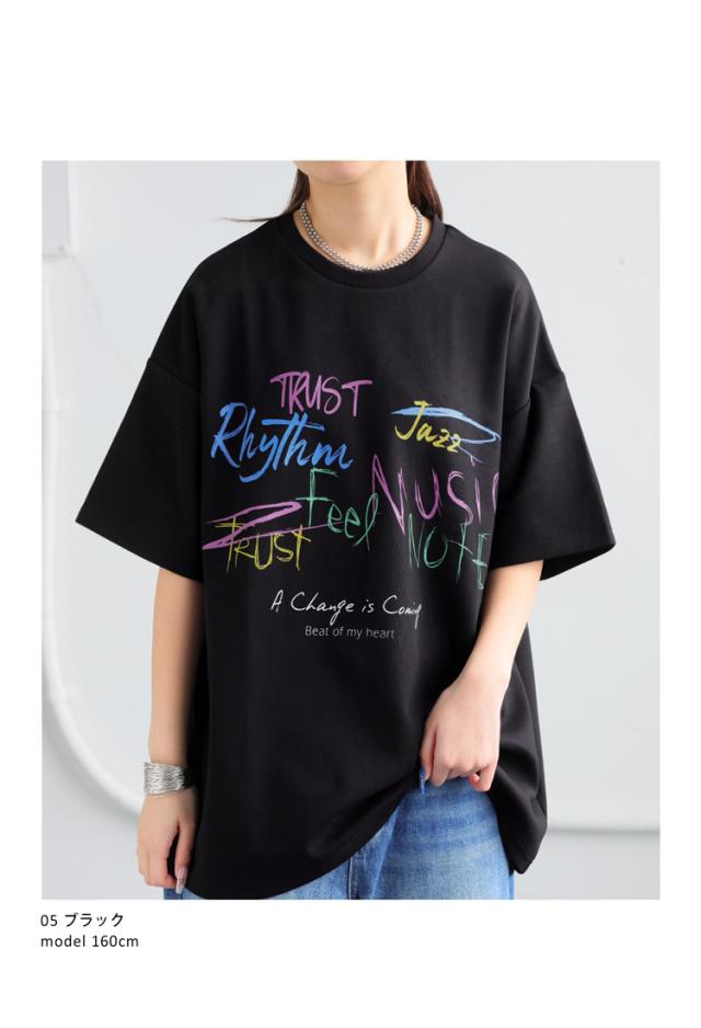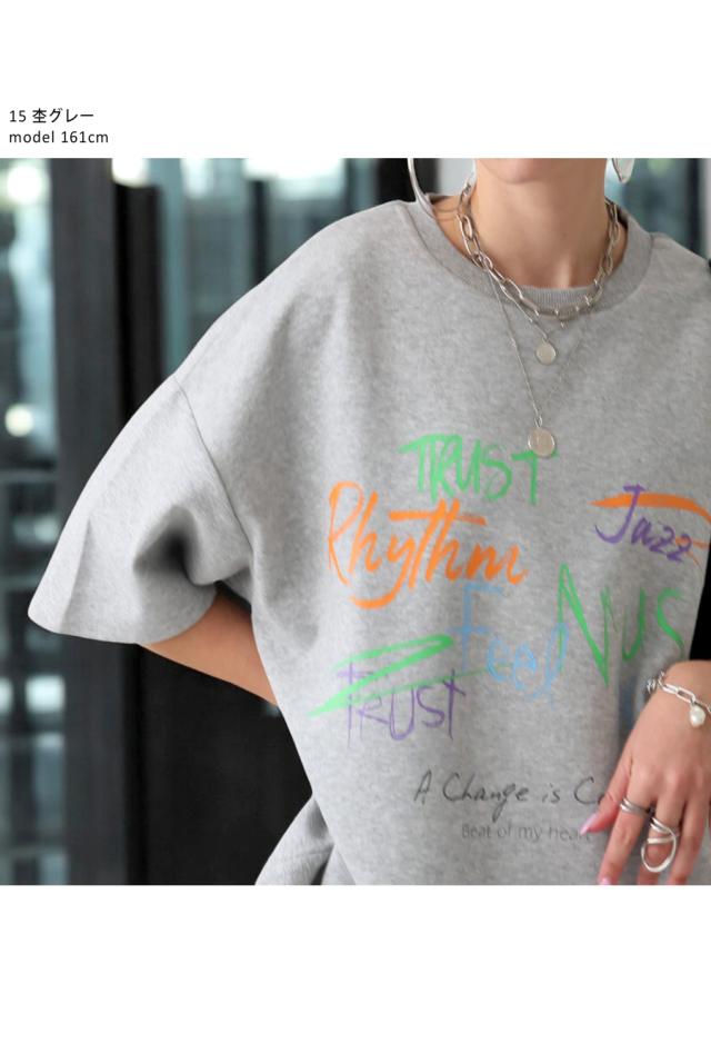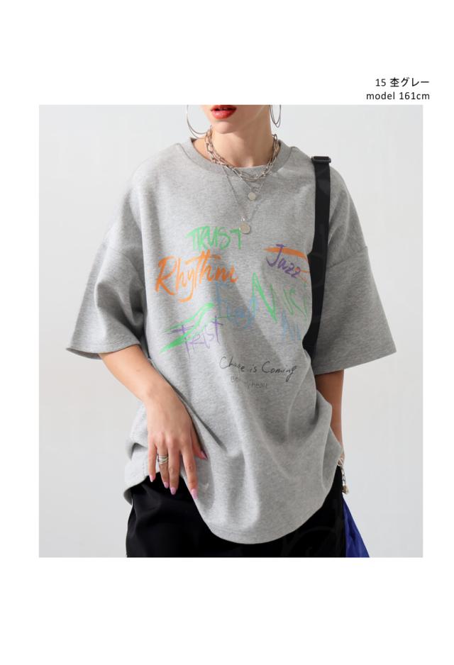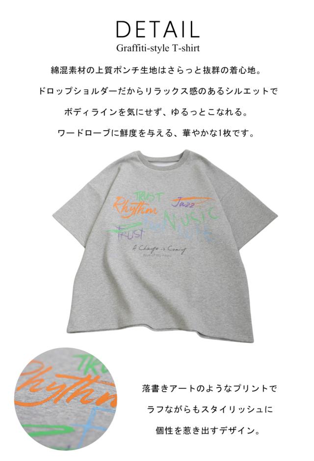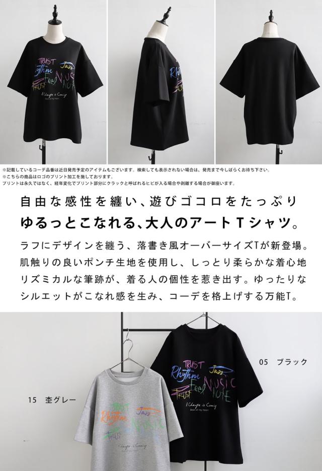 pn-00544 トップス 半袖 丸首 クルーネック プリントTシャツ 落書き風 ポンチ素材 綿 コットン オーバーサイズ ビッグシルエット モード 大人カジュアル スポーティー ストリート