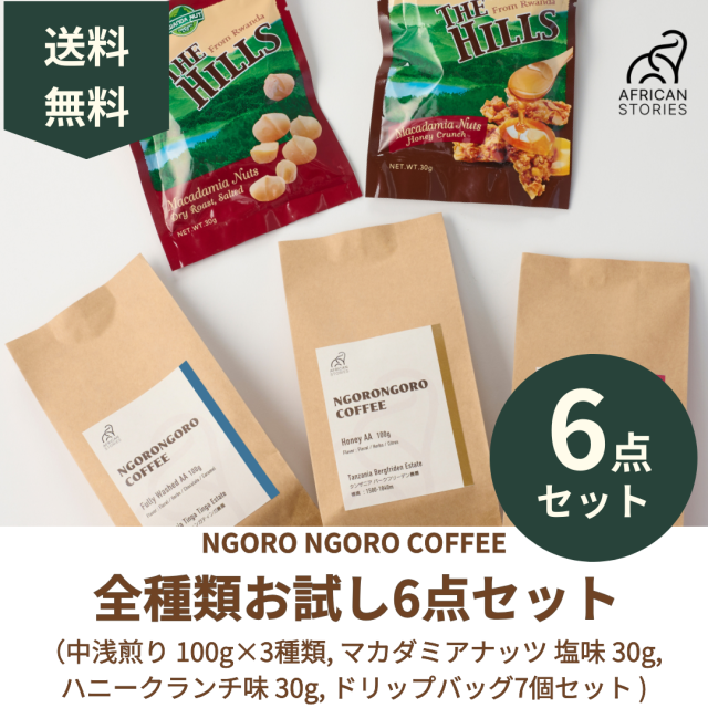 【AFRICAN STORIES】スペシャルティコーヒー & マカダミアナッツ 全種お試しセット (タンザニア産 中浅煎り 100g×3種類, ルワンダ産 塩味/ハニークランチ味30g各種1個, ドリップバッグ7個セット) ミディアム ロースト アラビカ ブルーマウンテン 無添加 ナッツ