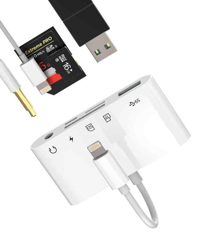 アップルUSB-A OTGアダプターMicro SDカードリーダー(5 in 1)Lightningケーブル同時急速充電3.5mmイヤホンジャック変換アダプター対応Apple MFI認証 カメラマイクロSD TF フラッシュカードかーどりーだーUSB 3.