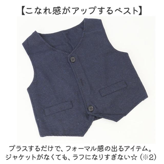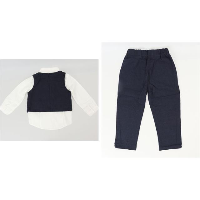 | 商品説明 | 【大人顔負けのかっこいいスタイル☆】 ・コーデに悩まずおしゃれにキマる! 男の子用「フォーマルスーツ」3点セット。 【スタイリッシュなセットアップ】 ・長袖シャツ、ベスト、ロングパンツの3点が1セットに!キレイめスタイルが完成☆ 【ベーシックなホワイトシャツ】 ・フロントボタン付きの、スタンダードなカタチに仕立てたシャツ。襟元には蝶ネクタイ付き。 (※1)蝶ネクタイは縫い付けられています。 【こなれ感がアップするベスト】 ・プラスするだけで、フォーマル感の出るアイテム。ジャケットがなくても、ラフになりすぎない☆ (※2)ポケットはフェイクです。 【ストレスなく履けるパンツ】 ・締めつけ感の少ないウエストゴム仕様で、着脱もスムーズ。左右にポケット付き。 【特別な日にとっておきの1着を】 ・お子さまが着用しやすい、軽やかな生地感。発表会などのイベントやお呼ばれシーンに! |