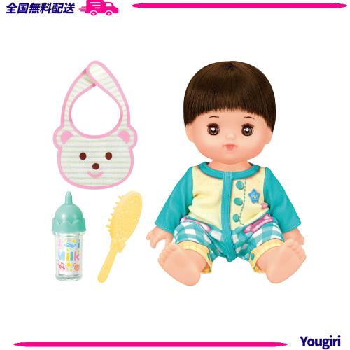 メルちゃんのおともだち、男の子のあっちゃん。だっこ、ミルク、おふろ、ねんね等いろいろなお世話遊びができます。おねんねするとおめめが閉じるよ。スタイとミルクも付いてるよ。