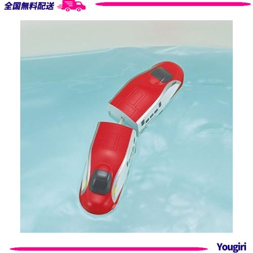 先頭車両と後部車両を引っ張るとE6系新幹線こまちが水の上を進みます。お風呂でもお部屋でも遊べます。