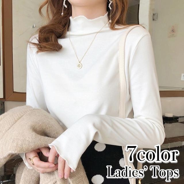 カットソー 長袖 レディース 女性用 トップス 無地 ハイネック フリル 定番 着回し カジュアル シンプル おしゃれ お出かけ