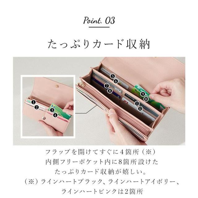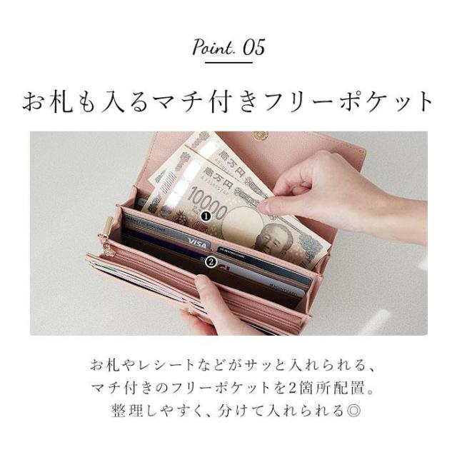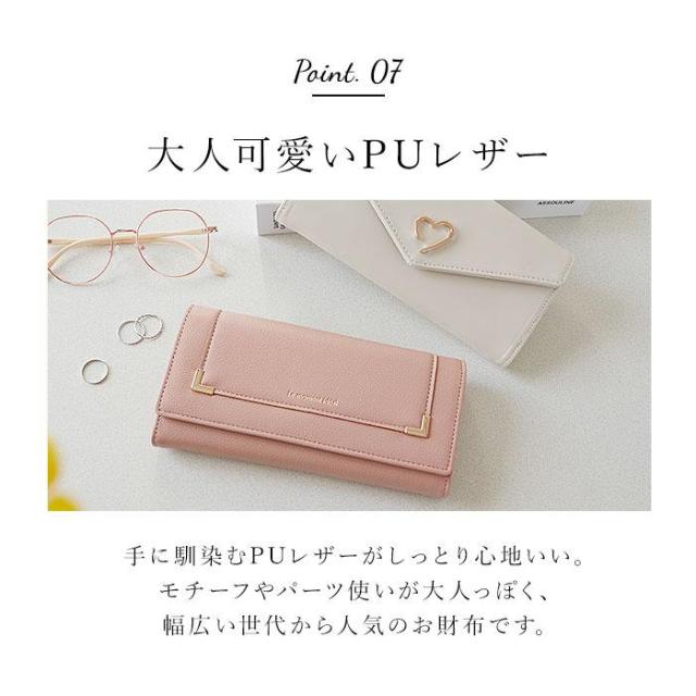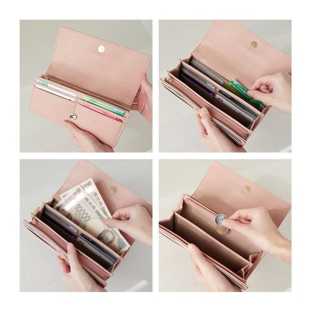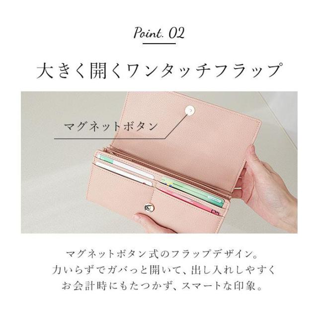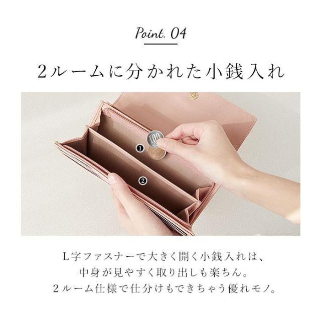 【デザイン性も利便性もばっちり】収納力があり、使いやすいシンプル設計。見た目もおしゃれな「長財布」。【簡単ワンタッチオープンタイプ】力いらずなマグネット式。ガバっと開いて出し入れしやすく、閉じれば中身のこぼれ落ちガード。【小銭を仕分け◎お会計もスマート】L字型に開くファスナー式。内部は2スペースに分かれており、サッと取り出せて手間取らない!【お札やレシートもすっきり整頓】・3つのフリーポケットを装備。お札やレシート、チケットなどもキレイに分けられる◎【増えがちなカード類もたっぷりと】カードポケットがたっぷり。クレジット・キャッシュ・ポイントカードもひとまとめ。【大人可愛いデザインをラインナップ】フロントの金具使いや、モチーフがワンポイント☆落ち着きがありつつ程よいキュート感が魅力。【ポケット仕様】内側:L字ファスナー式小銭入れ×1(内側2スペース仕様)、フリーポケット×3、カードポケット×10〜12