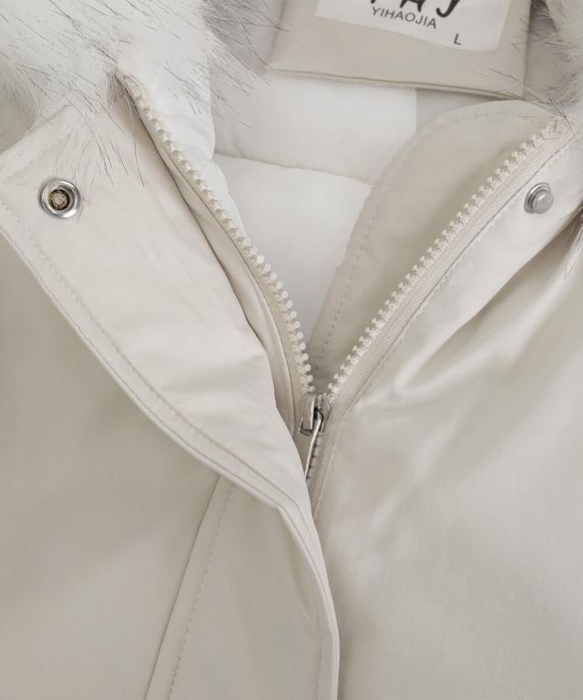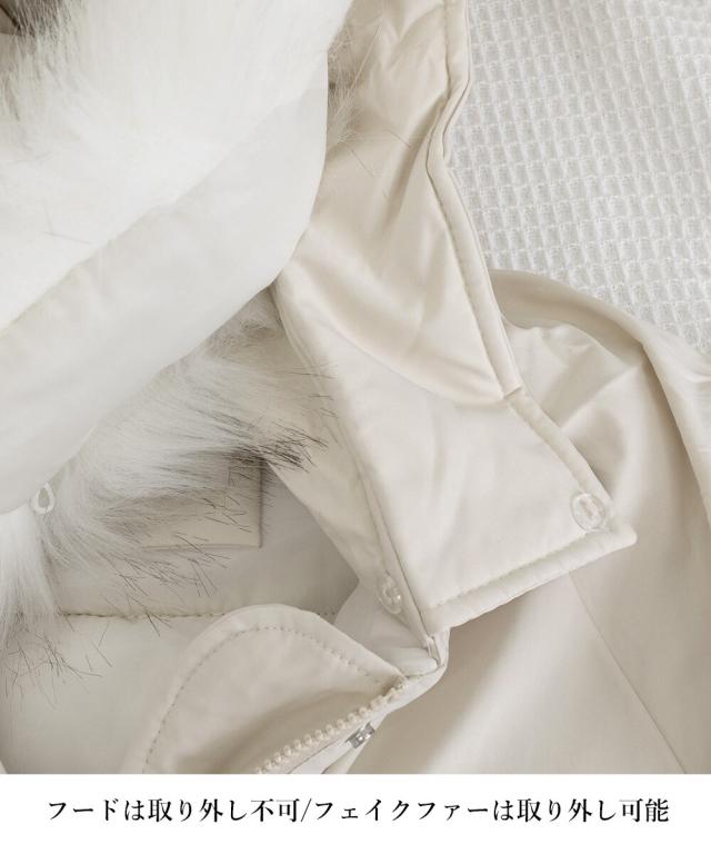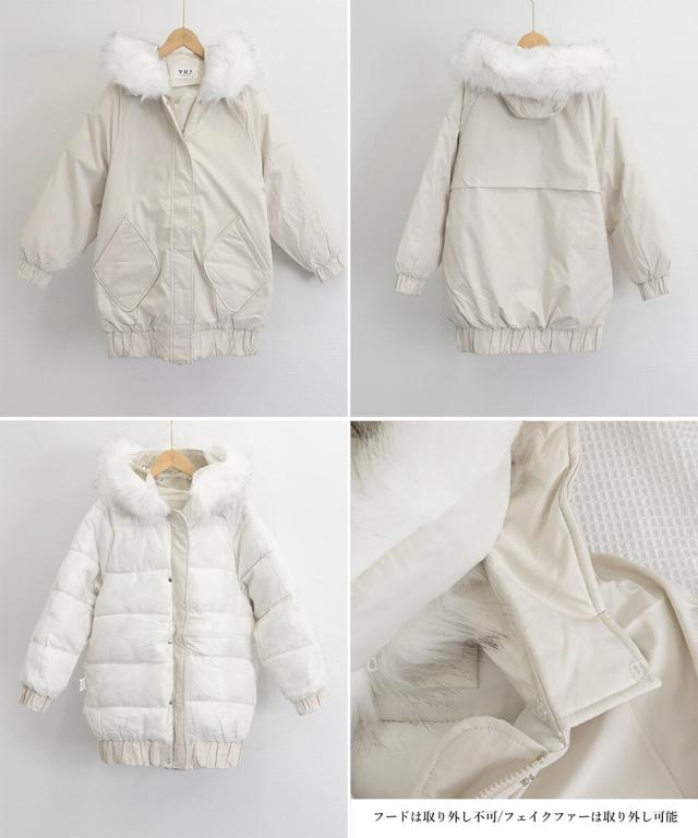 ふわふわとしたフェイクファーがフードに付いており、首元をしっかりとカバーしてくれるミドル丈のフェイクダウンジャケットです。