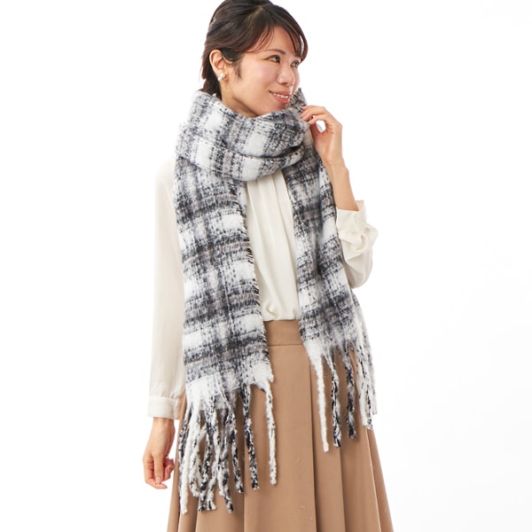 チェック柄の大判ストール。ぐるりと巻くだけでボリューム感たっぷりなので防寒対策もしっかりできます。