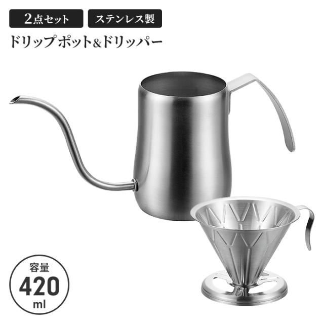 コーヒードリップポット ドリッパー 420ml セット 細口 ドリップポット ポット ステンレス サテン コーヒーポット 直火不可 ステンレスケトル やかん ケトル 新生活 一人暮らし コーヒー器具 お茶用品 ハンドドリップ おしゃれ
