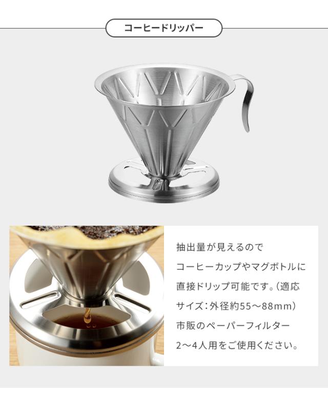 | ・丈夫でお手入れ簡単なステンレス製 ・注ぎ口が細口で軽量なので、注ぎやすい ・抽出量がみえるので、コーヒーカップやマグボトルに直接ドリップ可能 (適応サイズ外径約55〜88mm) ・市販のペーパーフィルター2〜4人用をご使用ください |