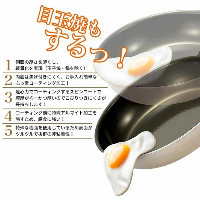 | ・オール熱源対応 ・焦げつきにくくお手入れ簡単なフッ素コーティング加工 ・扱いやすい軽量構造 ・丈夫なフチ形状 |