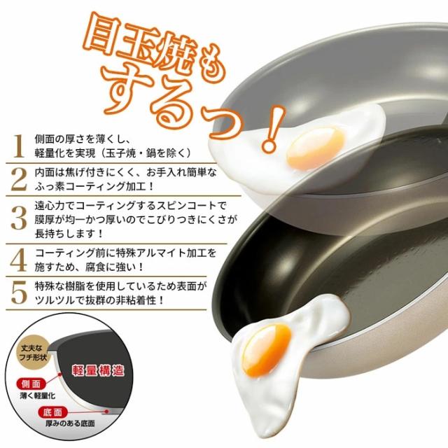 | ・オール熱源対応 ・焦げつきにくくお手入れ簡単なフッ素コーティング加工 ・扱いやすい軽量構造 ・丈夫なフチ形状 |