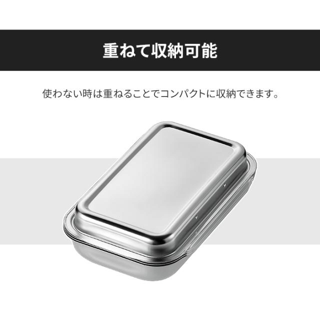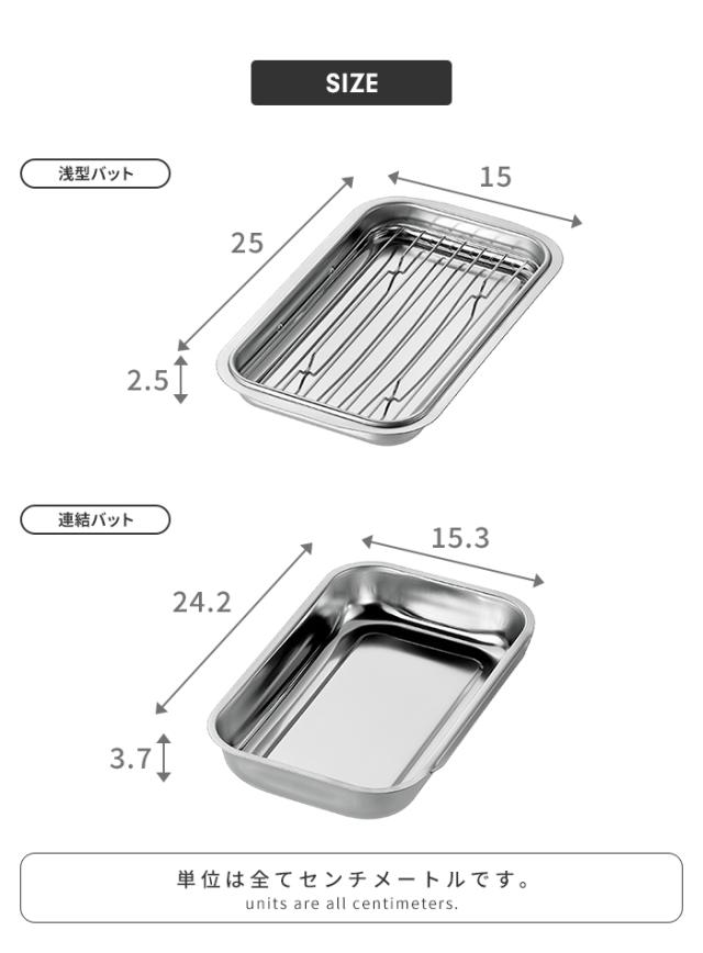 | [浅型バット]25×15×高さ2.5cm/150g [アミ]21×12.4×高さ1cm/50g [バット]24.2×15.3×高さ3.7cm/160g [本体収納サイズ]25×15×6.7cm |