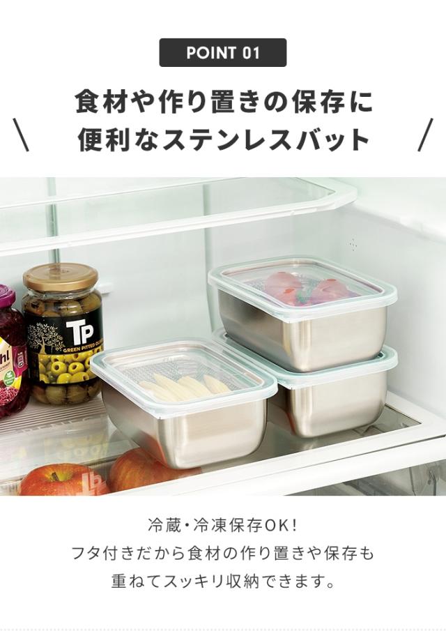 | 丈夫で耐久に優れたステンレス製バットと水切りザルのセット。 食材の作り置きや保存に便利な蓋付きで重ねて収納OK。 フチ裏は汚れがたまりにくく安全な折り込み加工。 バット専用の蓋は吊るせる穴付き。 冷蔵・冷凍保存にも対応。 日本製の確かな品質。 野菜の水切りや料理の下ごしらえ等キッチンで重宝する、便利で頼りになるアイテムです。 |