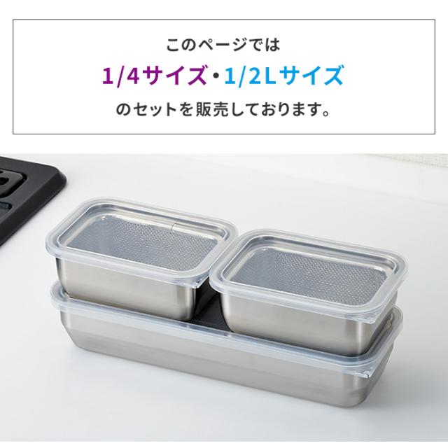 | [セット内容] ・バット1/4、蓋×各2 ・ザル1/4×2 ・バット1/2L、蓋×各1 ・ザル1/2L×1 |